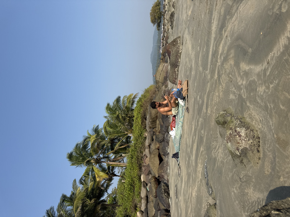 On a beach, a man sits on a mat, near a rock barrier covered in vegetation. The beach is sandy, with a mix of light and dark shades, marked by patterns on the sand surface. The man appears to be using a phone. He is surrounded by personal items. Behind the rock barrier, there are tall palm trees reaching towards the clear blue sky. The horizon is visible in the distance, appearing slightly hazy.