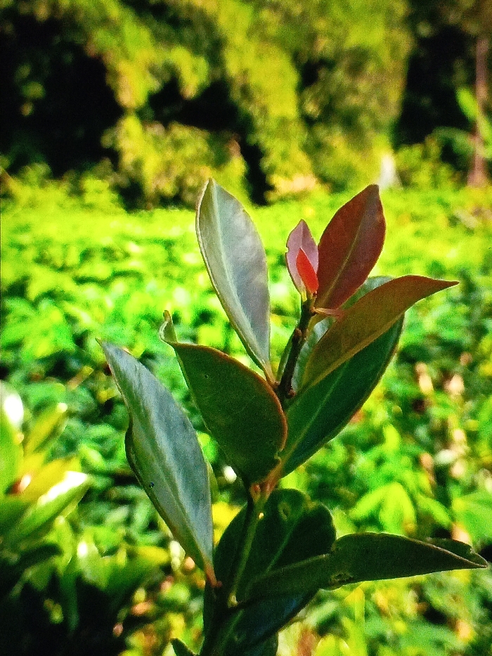 The image presents a close-up, vertical photographic study of a plant shoot featuring multiple leaves at various stages of growth, set within the city of Taungpi, Myanmar (Burma). The central subject is a stem emerging from the lower frame, bearing approximately seven to eight distinct leaves. Mature leaves are predominantly deep green, exhibiting a slight waxy or reflective texture and ovate shape. Towards the upper section of the shoot, newer leaves display a distinct reddish-brown coloration, with the nascent terminal bud showing a bright crimson or magenta hue. The leaves are arranged alternately along the stem, with visible veins. The background consists of a heavily blurred expanse of light and dark green foliage, indicating a natural outdoor environment. No human figures, animals, artificial structures, or overt actions are discernible within the frame.