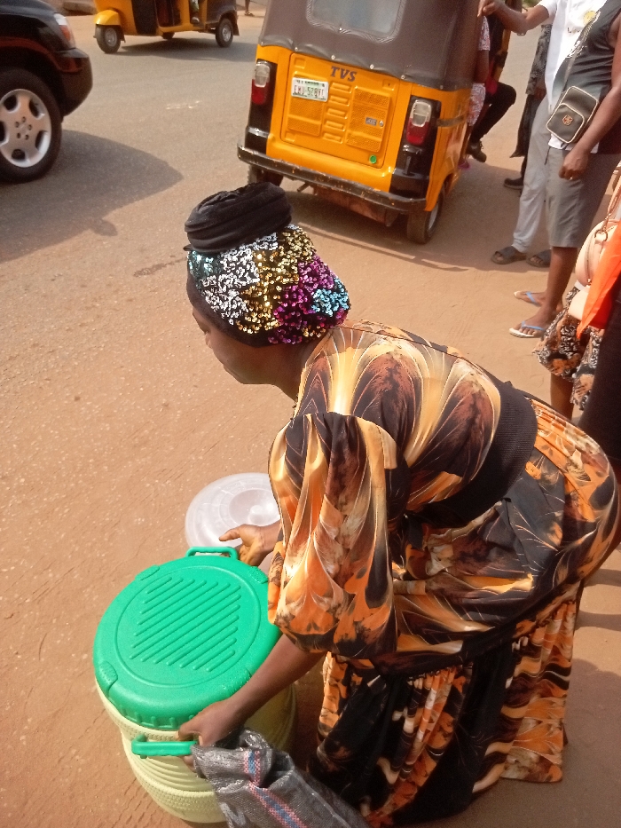 An outdoor scene in Nkpor, Nigeria, features a woman bending forward, centered in the mid-ground