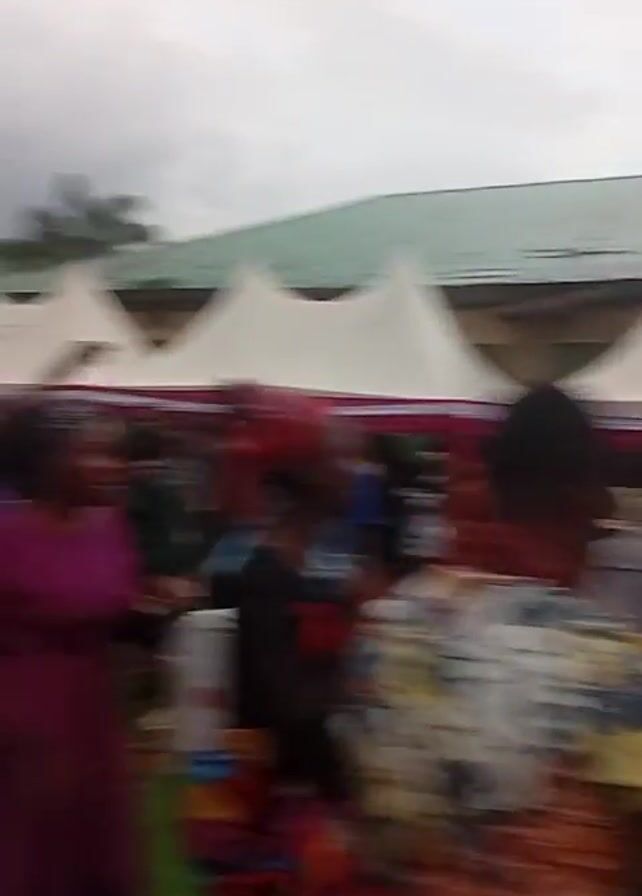 crowded outdoor event under white tents. People are walking around, some in colorful clothing. A banner for "SU ONITSHA AREA SISTERS" and "THE BRIDE Confectionary" is visible, advertising cakes, small chops, and drinks. There's a building in the background with a green roof. The overall atmosphere appears to be celebratory and social.