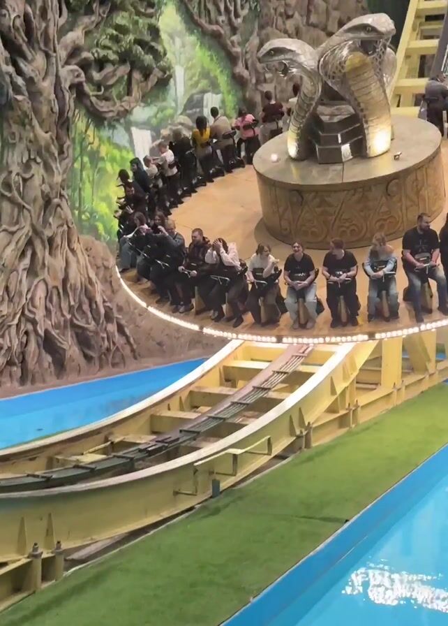 ride in an indoor amusement park. People are seated in a spinning ride vehicle that has a green track and travels through water. The ride has a snake-themed design with faux greenery. Passengers are screaming and appear to be enjoying the ride.
