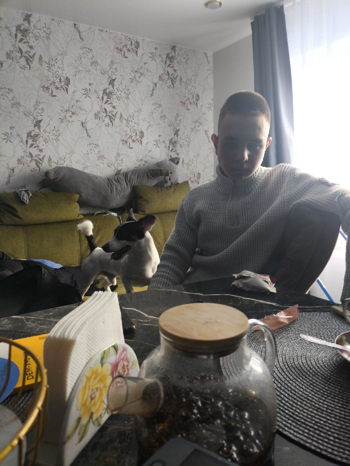 The scene depicts an indoor domestic environment in Красный Маяк, Russia, likely a living or dining area. In the immediate foreground, a dark-patterned table holds several items: a clear glass pitcher with a wooden lid, containing dark, granular material (possibly coffee beans or tea leaves) and a glass infuser; a white ceramic napkin holder with a floral design, holding white paper napkins; a gold-colored wire basket containing a yellow object with blue and black text; a smartphone with a dark case; a crumpled silver snack wrapper; a piece of orange plastic; a dark, ribbed placemat with a small white spoon and a partially visible patterned plate. In the midground, a young male with short, light hair is seated to the right, facing forward, wearing a light gray turtleneck sweater. His right leg is bent. A small dog, predominantly white with black patches on its head and tail, stands on the floor or a low surface to the left of the male. The dog has its tail curved upwards. Behind the dog, a light green sofa is visible, on which a large, grey, plush, elongated toy (possibly a stylized cat or animal) with yellow accents rests horizontally. The background features a wall covered with light-colored wallpaper displaying a pattern of delicate branches, leaves, white and pink flowers, and small green birds. To the far right, a window covered by dark grey curtains admits bright natural light. The ceiling is white, with a single recessed light fixture visible.