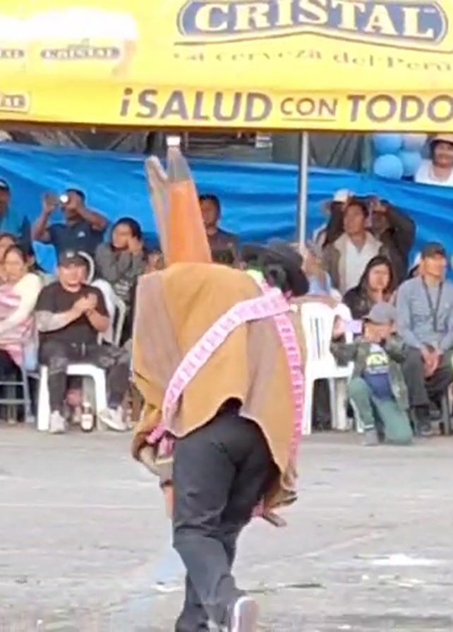 A man carrying a harp dances in an outdoor performance. He is wearing a brown poncho, black pants, a black hat, and a pink and white striped strap across his chest. A woman walks alongside him, playing a small drum. She is wearing a bright pink skirt, a turquoise sweater, and a black hat. Behind them, a crowd sits and watches. A yellow banner with "¡SALUD CON TODOS!" printed on it is visible in the background. The ground is gray and covered in green debris.