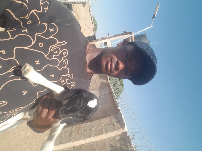 A young adult male, dark-skinned, wearing a dark blue mesh baseball cap and a black t-shirt adorned with light-colored stylized figures and letters, is depicted in a close-up outdoor scene in Agingi Zion, Nigeria. He is holding a small black and white goat with a white blaze on its forehead and white legs against his chest with his left arm. The background features a clear blue sky. To the left, a solar-powered street light on a pole stands next to a black water tank elevated on a concrete structure. To the right, a light-colored concrete block wall topped with razor wire extends horizontally. Sparse green vegetation is visible beyond the wall and water tank structure, and the ground appears to be dirt.