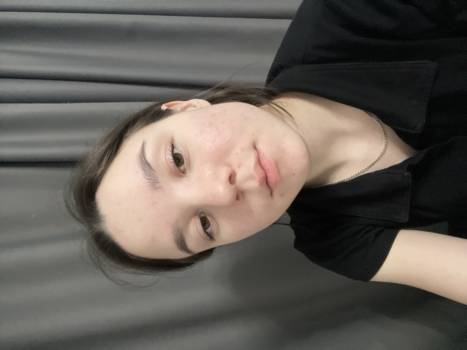 A close-up portrait depicts a young female individual positioned against a dark grey background composed of vertically folded curtains. The subject exhibits brown hair, brown eyes, and fair skin with visible acneiform lesions on the cheeks and forehead. She is attired in a black collared, short-sleeved shirt and wears a thin, silver-toned chain necklace. Her head is slightly tilted, and she maintains direct eye contact with the camera, displaying a neutral facial expression. The scene is situated indoors. The specific location within Chaikovsky, Russia, cannot be determined from the visual information presented in the image.