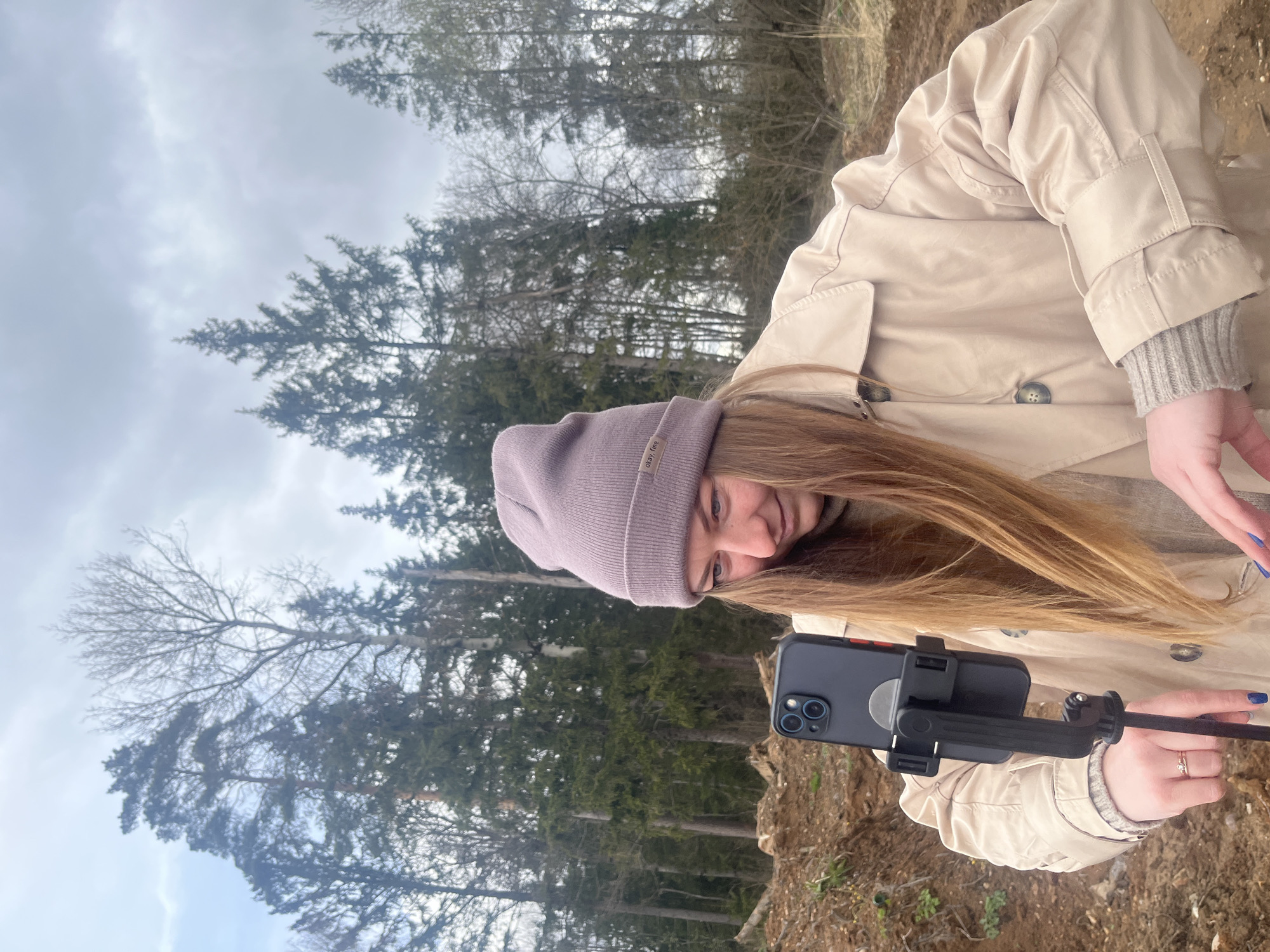 A woman stands outdoors in a wooded area. She is wearing a beanie, a tan coat, and a grey sweater. She is holding a phone attached to a black selfie stick. In the background, there are tall trees and a cloudy sky. Based on the geotag data, the location is likely Ivlevo, Russia.
