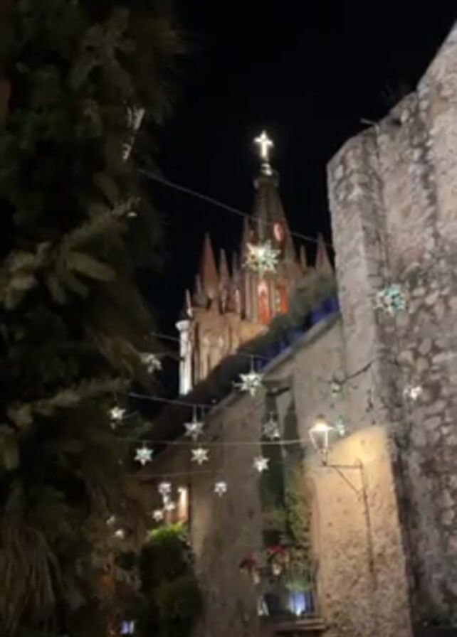 A nighttime shot looks up an alleyway at a church spire with a cross on top. The church is lit from within and appears orange. On both sides of the alleyway are rough stone walls. Across the alleyway, strings of lighted stars hang from the buildings. A tree stands to the left. An ornate street lamp is attached to the right wall.