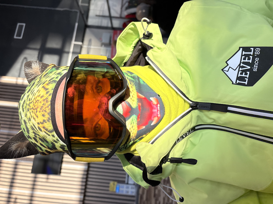 A person is depicted from the upper chest upwards, positioned outdoors in Korobitsyno, Russia, wearing winter sports attire. The individual's eyes are visible through large, black-framed ski goggles with highly reflective orange-red lenses, marked "NEON Red Iridium" on the lower right lens. A lime-green leopard-print beanie with dark, pointed animal ears covers the head. Below the goggles, a neck gaiter or balaclava with a graphic print of a roaring big cat's open mouth and fangs is visible. The person wears a bright neon-lime green winter jacket, zipped up, revealing a yellow inner layer. The jacket features a black and white logo on the right chest depicting a mountain silhouette above "LEVEL" and "since '89" below it. A black zipper pull with "LEVEL" embossed is visible. The background shows a vertical slatted building facade, indicative of a ski resort or outdoor recreational area, under direct sunlight.
