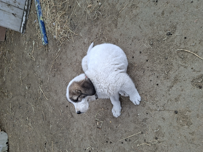 In Moshtanets, Bulgaria, a white puppy with brown markings on its head and ears, wearing a dark collar, is observed lying on a dirt surface. The puppy is positioned on its stomach, with its head raised and turned to the left. The ground is sparsely covered with dry straw and small, dark, granular pellets. In the background to the upper right, a light-colored wooden board or panel leans vertically, and a blue-painted object rests horizontally on the ground amidst additional straw.