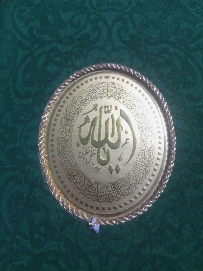 A circular brass-tone medallion is centered on a dark green, patterned fabric surface. Its central feature is large Arabic calligraphy depicting 'Allah' (الله), encircled by multiple lines of smaller, intricate Arabic script. A braided gold-tone border frames the medallion's perimeter. The dark green fabric displays a subtle, repeating embossed pattern. Illumination highlights the metallic surface and casts a faint shadow toward the lower left. The object is situated in Zee Pin Kone, Myanmar. No people, actions, or interactions are depicted.