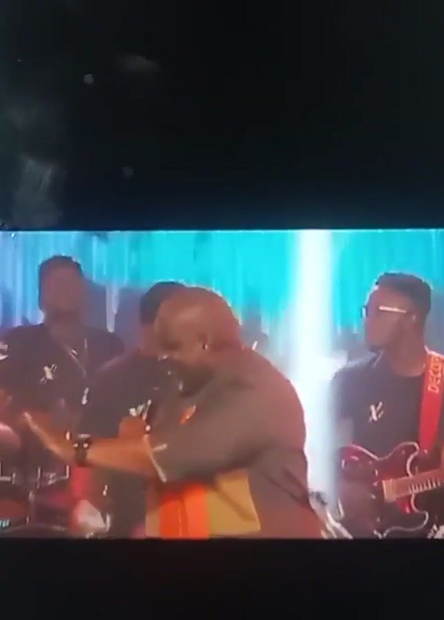 A screen shows a recording of a musical performance. On a brightly lit stage, a dark-skinned man in a tan and orange shirt sings with a microphone. A band behind him plays instruments, and they wear black shirts with a white V logo. The stage is packed with musicians and equipment. The recording has the words “one love” at the bottom. The recording is then shown on a cell phone.