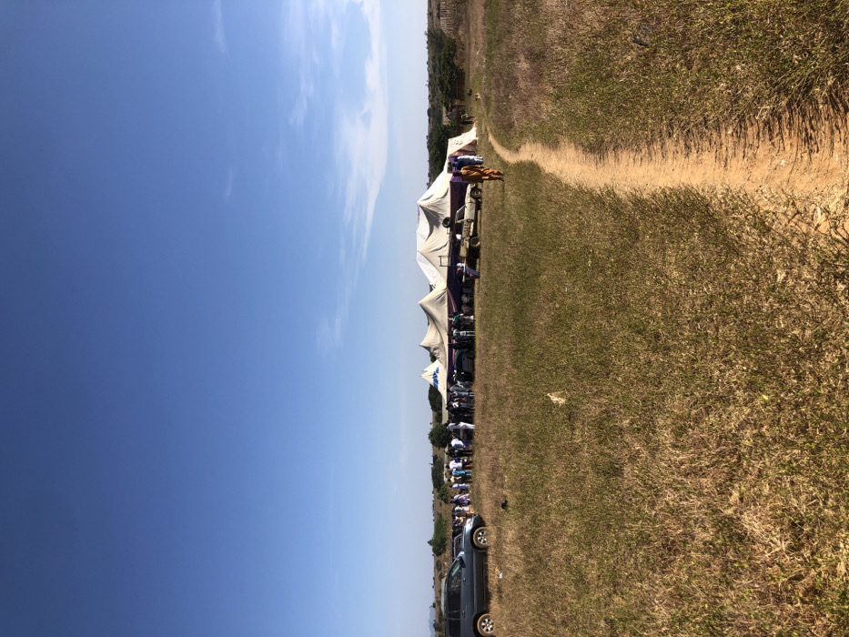 A daytime outdoor scene displays a clear blue sky above rows of white tents and parked cars stretching along a grassy field. A dirt path meanders through the dry grass towards the tents. Some people are visible near the tents and the path in the distance. The vegetation appears dry, suggesting a warm climate.