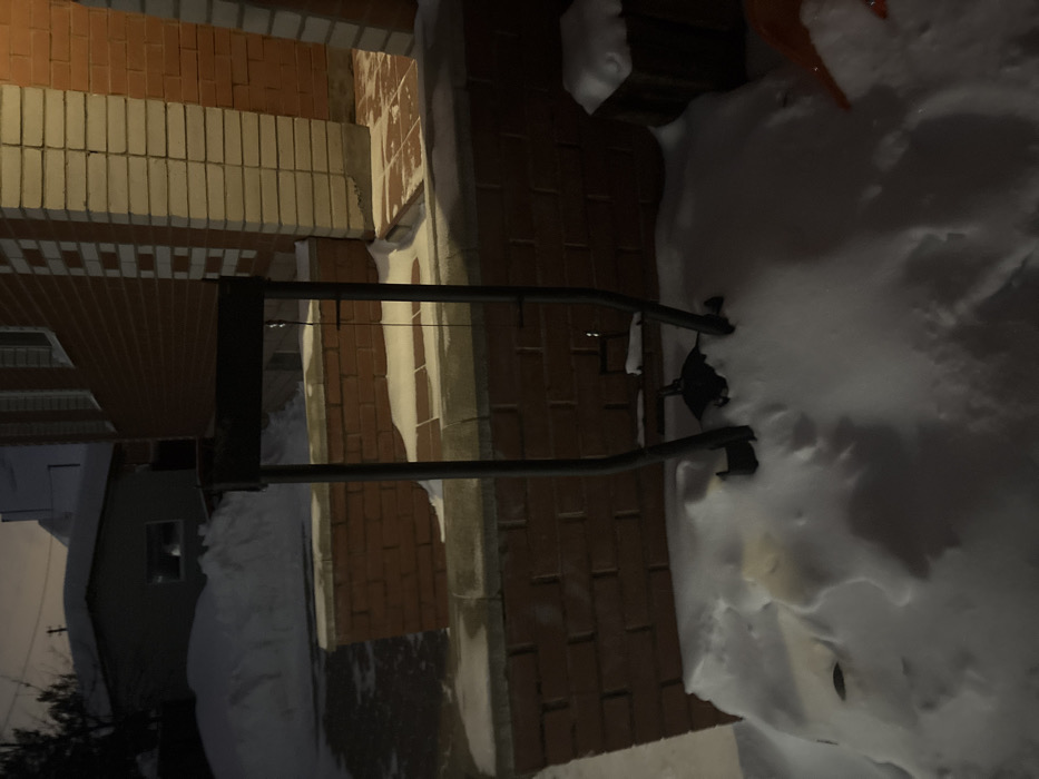 This image depicts an outdoor, snow-covered residential scene under low light conditions, likely at night, in Ферма, Russia. In the foreground, a dark metal, U-shaped frame, potentially part of an outdoor grill or equipment, stands partially buried in deep snow. A thin string or wire hangs from its upper crossbar. Behind this, a low brick wall with a lighter coping stone separates the foreground from a higher, paved area. To the left of the frame, a single-story building with a snow-covered roof and a visible rectangular window is partially obscured by large snowdrifts. To the right, a two-story building constructed of reddish-brown brick features a prominent white brick column and a tiled entrance or porch. A snow-covered wooden crate and the exposed handle of an orange shovel are visible in the lower right portion of the frame, also partially buried in snow. No individuals are present in the scene.