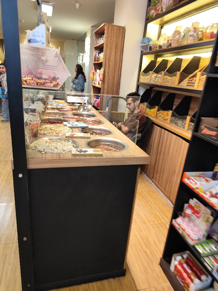 The image depicts an indoor retail environment, identified as a store within Joubar Municipality, Syria. The scene features a counter with bulk food items, multiple shelving units displaying various products, and three individuals. **Individuals:** A male employee, appearing to be in his 20s or 30s with short dark hair, a beard, and glasses, is seated behind a wooden counter. He wears a brown short-sleeved shirt and is observed looking down at a mobile device. A female customer with long dark hair, dressed in a light blue denim jacket, stands on the left side in front of the counter, observing the merchandise. A child or young person is partially visible on the far left, standing in the customer area. **Retail Space and Merchandise:** The central fixture is a wooden-topped counter with a black base. It incorporates at least nine circular metal bins embedded into its surface, filled with various bulk items such as shelled peanuts, almonds, pistachios, and coffee beans. Small metal scoops are present in some bins. A clear plastic container labeled "domak," containing wrapped candies, is positioned on top of the counter. A transparent glass barrier separates the customer side from the counter area. To the right, a multi-tiered display unit features numerous glass jars and containers filled with colorful bulk candies and sweets on its upper shelves, illuminated by warm yellow strip lighting. Below these, six open-fronted bins (three black, three wooden-toned) contain bulk items like colorful gumballs, candies, and seeds. A tall, black shelving unit on the far right displays various packaged products, including several Kinder brand chocolates and sweets. Another wooden shelving unit is visible in the background on the left, holding additional packaged goods. **Environment:** The flooring consists of light-toned wooden or laminate planks. The space is well-lit by a combination of overhead fixtures and integrated lighting within the display shelves. The walls are predominantly light-colored, complemented by some wooden paneling. No direct interactions between the individuals are captured.