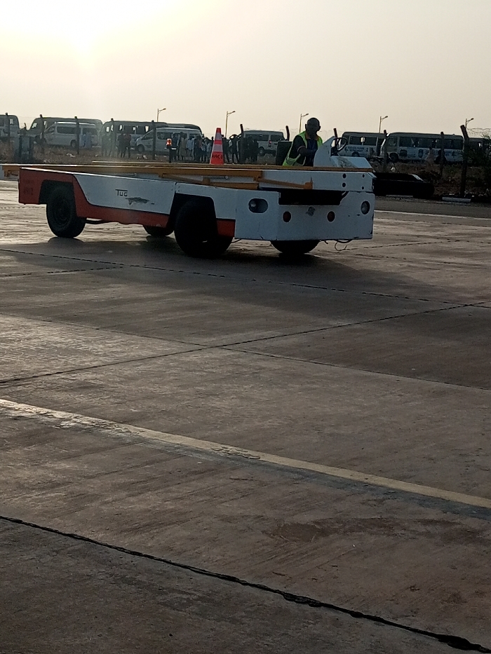 white and orange airport tug, labeled "TUG", driving on a concrete tarmac at the Nnamdi Azikiwe International Airport in Abuja, Nigeria (latitude: 12