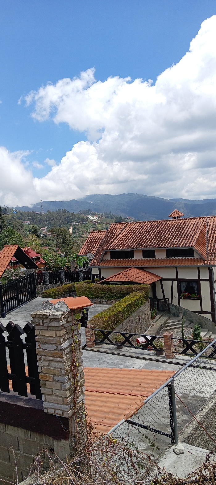 The image displays an elevated view of a residential area within Colonia Tovar, Venezuela, under a partly cloudy blue sky. The upper third of the frame presents a clear blue sky interspersed with white cumulus clouds, denser on the right. In the background, verdant, forested mountains extend across the horizon, with a discernible communication tower on a distant ridge and multiple white structures, consistent with greenhouses, visible on a far slope. The mid-ground is dominated by a two-story building exhibiting German Fachwerk architectural style. This structure features a steeply pitched, reddish-brown tiled roof, light-colored walls with dark half-timbering, and dark-framed windows. A lower-level window on the right includes a flower box containing red flowering plants. An attached entrance area with a smaller tiled roof and dark steps leads to a dark entrance. In the foreground, on the left, a vertical pillar constructed from light-toned, stacked stone blocks is present, topped with a small red-tiled cap. Dark wooden picket fencing is attached to the left side of this pillar. Vines with green foliage and reddish stems grow on the pillar. Below the pillar, a concrete block wall is partially visible. To the right, a chain-link fence partially obscures a concrete surface and a segment of a red-tiled roof in the lower right corner. A decorative wooden railing with X-shaped cross-members, featuring small brick-like pillars topped with terracotta caps, delineates a paved area in the mid-ground, displaying several potted plants. Green, manicured hedges are planted along a stone retaining wall, forming a terraced landscape that ascends towards the main house. Additional buildings with red-tiled roofs are visible among trees on the left and in the background. The scene is devoid of human presence or activity.