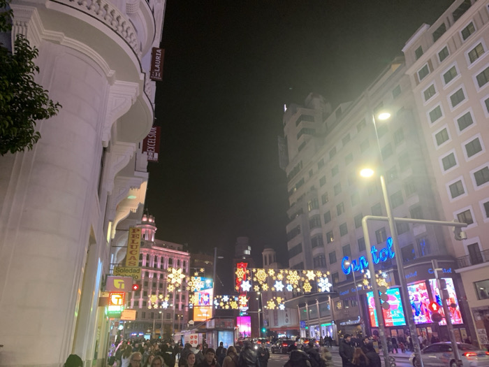 A nighttime urban scene features a crowded street adorned with holiday decorations