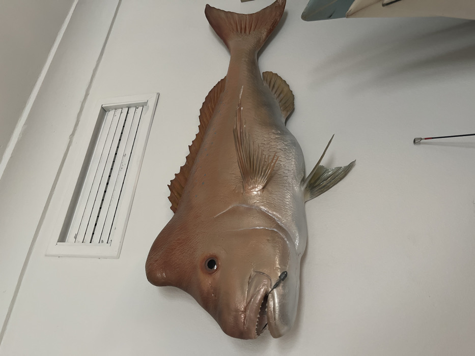 A mounted, reddish-brown fish with silver highlights hangs vertically on a white wall