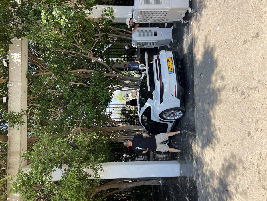 A white Porsche is parked near trees and white concrete pillars. A man wearing a black shirt and khaki shorts is standing next to the car, with the driver's side door open. A couple of portable air conditioners are behind the car, with a man in a white hard hat tending to them. Other people can be seen in the background. The license plate on the Porsche reads "447 88 303".