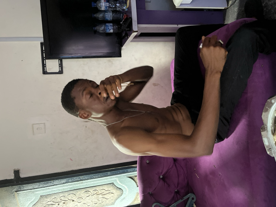 A single male individual is seated on a purple, tufted sofa within an indoor setting. He has a dark complexion, short dark hair, and is shirtless, wearing dark trousers and a silver-colored chain necklace. His right hand is positioned near his face, while his left hand holds a small white object, possibly a cigarette or similar item. His eyes appear partially closed. To his left, a blue/green ornate door is partially visible. On the wall above the sofa, a white electrical switch is present. To his right, a purple table with white legs holds a black flat-screen television and several plastic water bottles. A black television wall-mount bracket is affixed to the wall above the television. Various small items, including what appears to be a glass shisha pipe base, are also on the table. In the immediate foreground, a metallic circular object with contents is partially visible. The walls are white or off-white. The specific location within the city of Lokoja, Nigeria, cannot be determined from the visual information provided in the image.