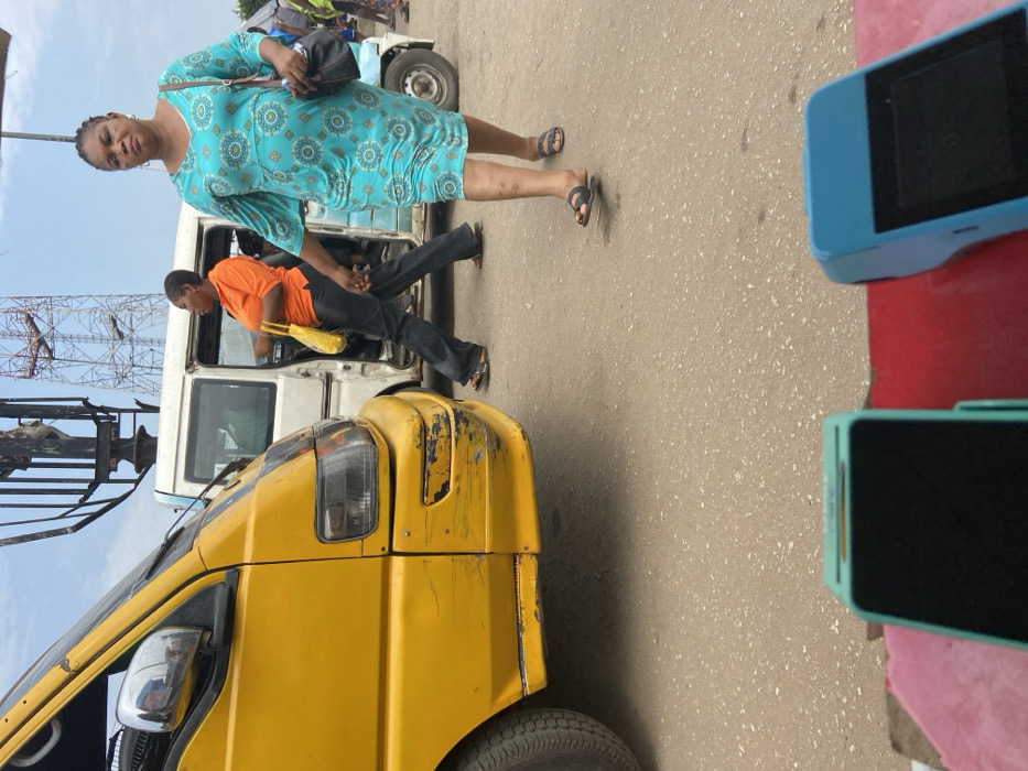 The image portrays an active urban street scene in Onitsha, Nigeria, under a bright, possibly overcast, daytime sky. In the immediate foreground, two electronic point-of-sale (POS) terminals are positioned on a red surface; the left terminal is teal, and the right is blue, both displaying dark, blank screens. The midground features vehicular and pedestrian activity on a paved road. On the left, a bright yellow commercial minivan is partially visible, showing noticeable paint chipping and wear on its front bumper and fender. To its right, a white minivan is parked with its passenger sliding door open. A woman in an orange short-sleeved shirt, dark trousers, and dark sandals is observed in motion, appearing to exit or move near the white minivan, while holding a yellow bag. To the right of the minivans, a second woman, wearing a turquoise-blue patterned dress and dark flat sandals, walks towards the viewer. She carries a dark shoulder bag, and her facial expression is neutral. In the background, a tall communication tower is visible on the right, along with other indistinct structures and the faint presence of additional people and vehicles, indicating a bustling street environment. The ground is a uniform paved surface.