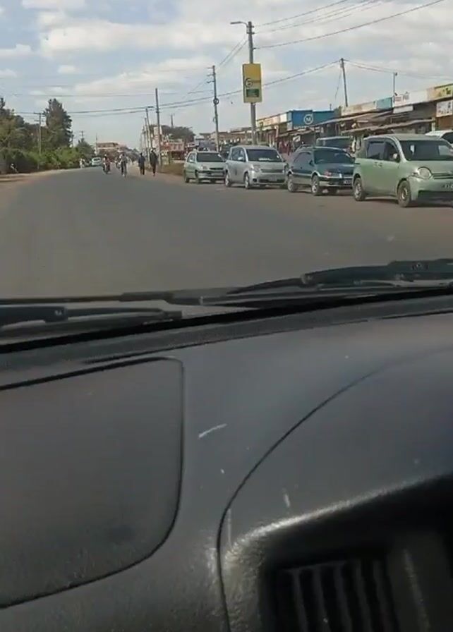 A car travels down a road. The road is flanked by a row of parked cars on the right. On the right side of the road are also several commercial buildings with storefronts. A motorbike passes the car going in the opposite direction. The motorbike is carrying a gas tank and other items. Several people walk along the road in the distance. Utility poles line the roadside. The sky is bright and cloudy.