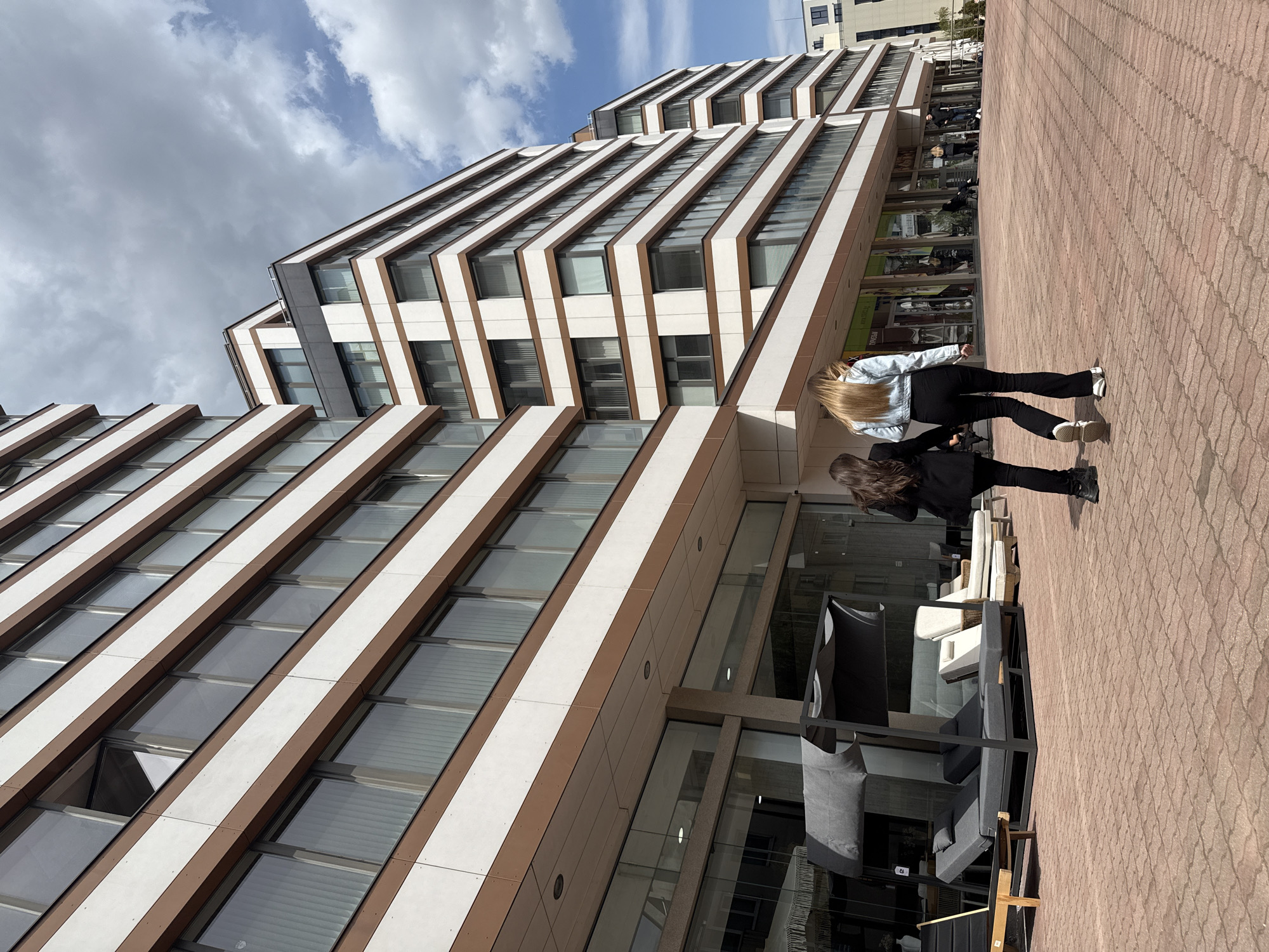 n outdoor scene in Sofia, Bulgaria, featuring a modern building with a distinctive facade of horizontal bands in white and brown. The building is tall and multi-storied, with numerous windows. The sky is visible with a mix of blue sky and clouds. In the foreground, two young women are walking on a brick-paved sidewalk. One is wearing a light blue denim jacket and black pants, and the other is dressed entirely in black. Next to the building, outdoor furniture is displayed, including chairs and couches. The scene suggests a retail or commercial area.