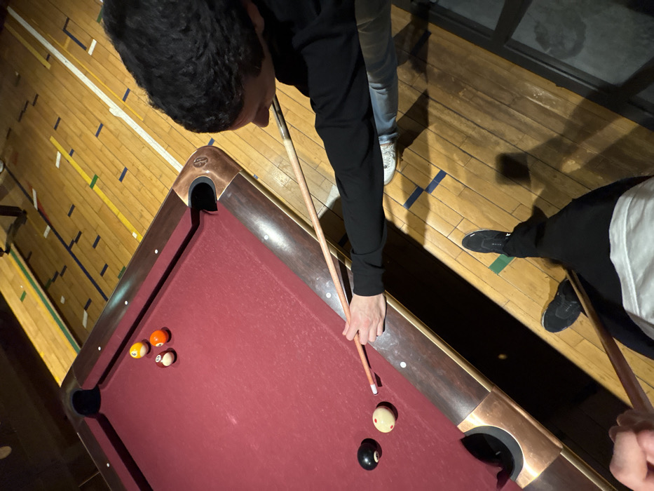 An overhead shot shows two people playing pool on a burgundy pool table. Balls are scattered, with one person poised to strike the cue ball with a pool cue. The floor is wooden with colorful painted markings. One person is wearing jeans and white sneakers; the other is wearing black pants and sneakers. The pool table has copper-colored corners. The lighting is dim, casting shadows on the table and floor.