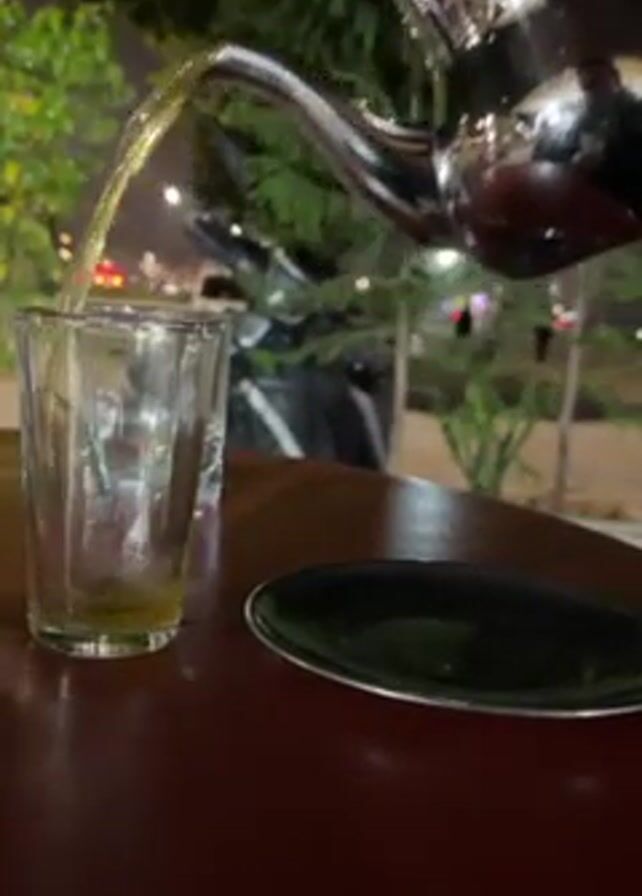 silver teapot pouring a yellow liquid into a clear glass on a red table outdoors at night. A black saucer is next to the glass. Green trees, street lights, and traffic are visible in the background. The pouring action fills the glass with a foamy beverage.
