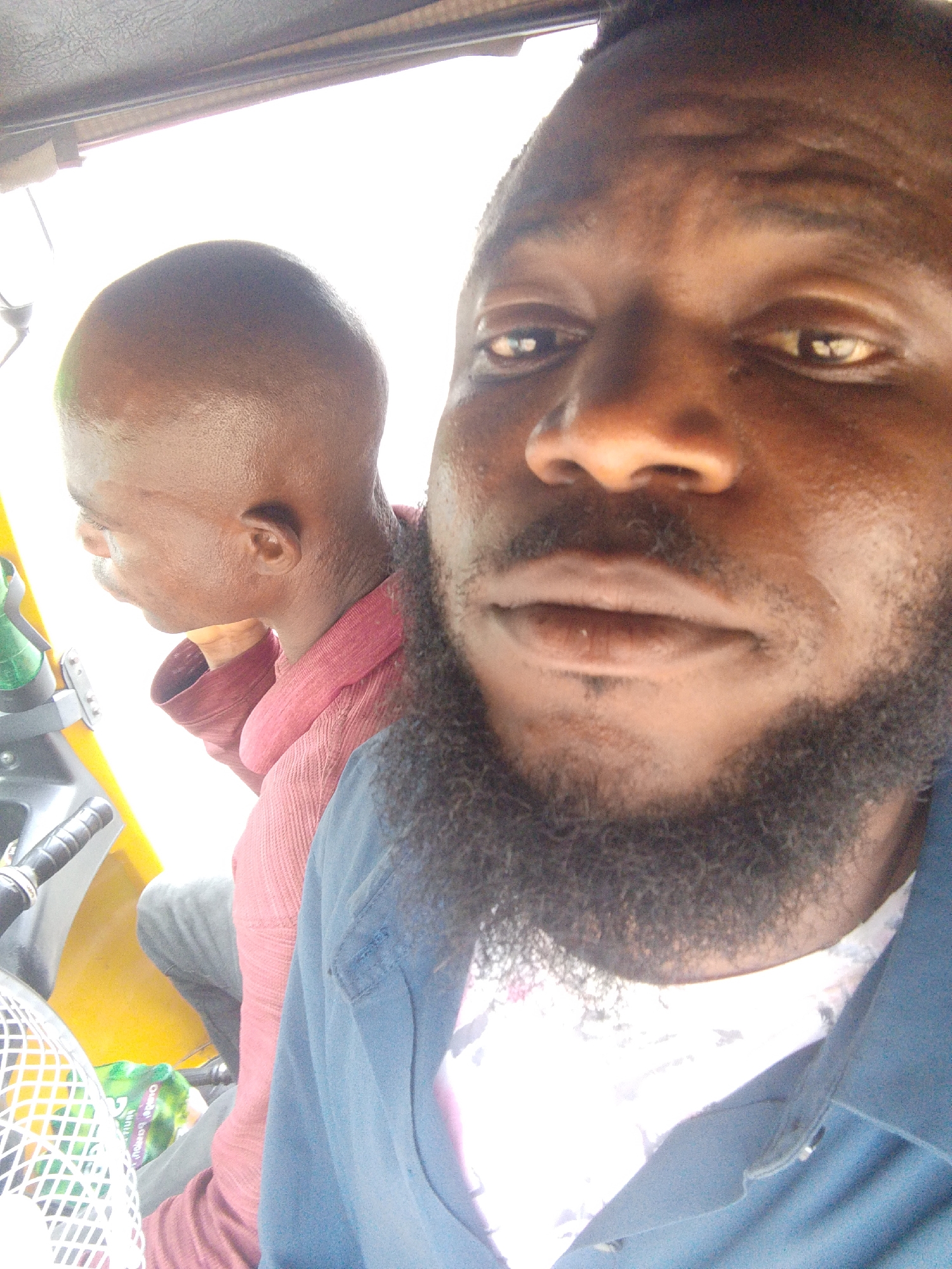 Two African men are sitting in what appears to be a commercial tricycle, based on the handlebars visible on the left side of the frame. The man in the foreground is the focus of the image. He has dark skin, a full beard, and is wearing a blue shirt over a white patterned T-shirt. Behind him, another man with a shaved head is wearing a pink button-down shirt and looks toward the side. The interior appears to be yellow. A white basket with green packaging is also visible. The location is identified as Lokoja, Nigeria.