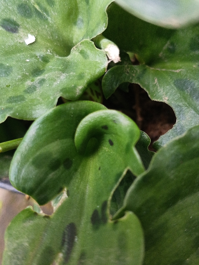 The image captures a cluster of Calathea Rufibarba leaves, exhibiting various shades of green. Some leaves have dark spots and ruffled edges. Dusting is visible on the leaves, particularly on the larger ones. A curled, younger leaf prominently displays a lighter green hue. The focal point is a partially obscured glimpse of brown soil in the background, framed by the foliage.