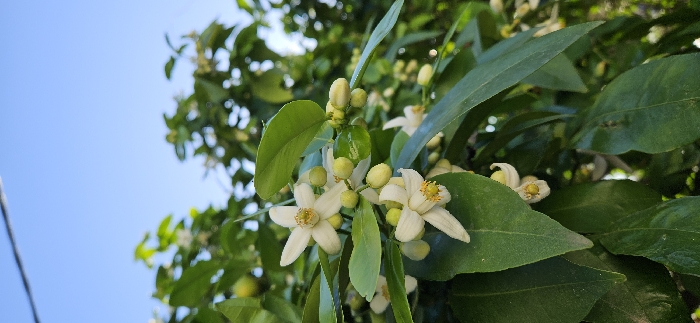 - "The image depicts a close-up, low-angle view of a flowering branch from a fruit tree, likely citrus, located in Kiryat Bialik, Israel" by FM-NY7P22, licensed under CC BY 4.0
