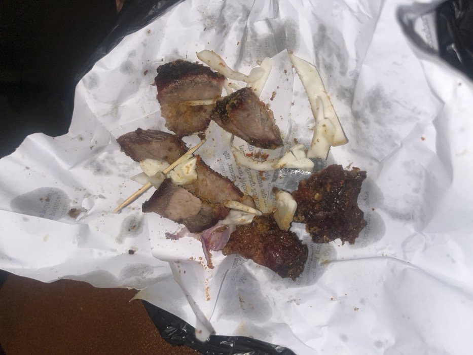 Scraps of skewered meat rest on crumpled white paper within a plastic bag
