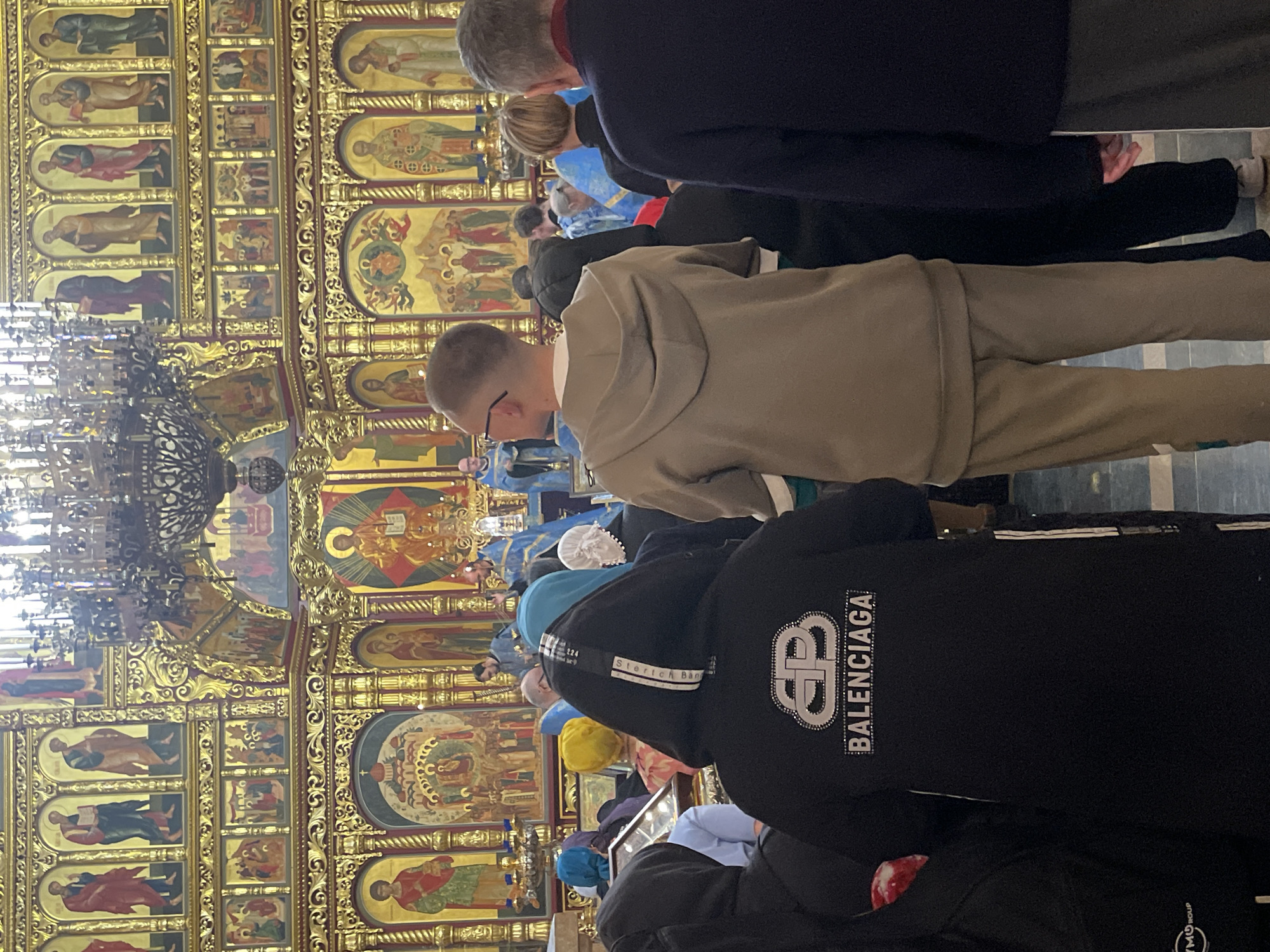 The image depicts the interior of the Ascension Cathedral (Zenkov Cathedral) in Panfilov Park, Almaty, Kazakhstan. The dominant feature is the elaborately gilded multi-tiered iconostasis adorned with numerous religious icons, which occupies the entire background. A large, dark, ornate metal chandelier with multiple lights hangs from the ceiling, partially visible at the top center. A congregation of approximately a dozen individuals is present, mostly viewed from the back, standing and facing the iconostasis and altar area. In the foreground, from left to right: 1. A person wears a black hooded sweatshirt with a prominent white "BALENCIAGA" logo and a stylized "BB" emblem, embellished with sequins or rhinestones, on the back. A white stripe with "Stretch Balenciaga" text is visible on the hood. 2. A young male individual, seen from the back, wears a light brown or olive-green hooded sweatshirt and matching sweatpants. He has short hair and wears glasses, slightly turning his head to the right. 3. An older male individual, seen from the back, wears a dark blue sweater with a hint of a red collar or scarf underneath. In the mid-ground and background, other congregants are visible, including several women wearing head coverings in blue, yellow, and white. Towards the altar area behind the congregation, at least two priests in blue and gold vestments are conducting a service, one raising his right hand in a gesture. A glass-covered display case, likely containing an icon, is visible among the congregants on the left side. The floor is partially visible in the lower right, appearing to be light-colored.