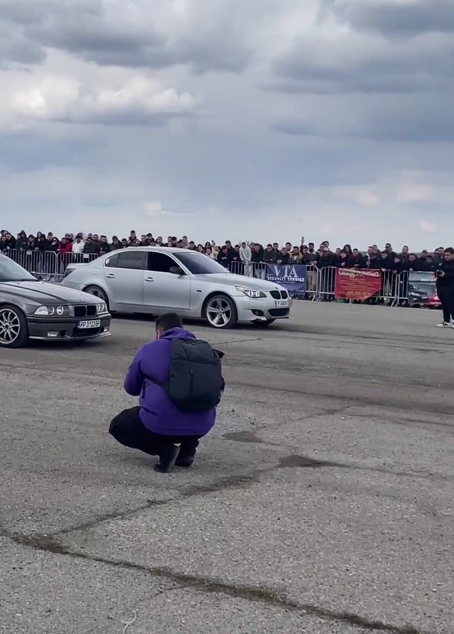 The video captures two BMW cars performing a burnout in front of a large crowd