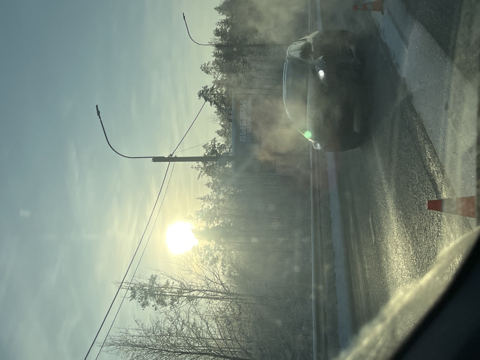 The scene depicts a winter road environment in Vsevolozhsk, Russia, viewed from inside a vehicle through a partially frosted windshield. The bright, hazy sun is low in the sky on the left, obscured by a line of frost-covered deciduous and coniferous trees, casting strong glare and reflections across the frame. The sky is a pale blue with faint cloud cover. The two-lane asphalt road appears damp or icy in patches, reflecting the sunlight. A silver metal guardrail runs along the right side of the road. A dark-colored SUV or crossover vehicle, with its headlights illuminated, is traveling towards the viewer on the right side of the road. Significant steam or exhaust emanates from the front of this vehicle, indicating cold ambient temperatures. A green lens flare or reflection is present on the front passenger side of the SUV. On the right shoulder of the road, two orange and white traffic cones are visible, one in the immediate foreground and another further back. Overhead, multiple power lines stretch across the scene, supported by utility poles. Two dark lampposts with curved arms are also visible, one in the midground on the right and another further in the distance. Behind the SUV and trees, a large billboard or sign is partially visible, displaying the Russian word "ВЫБЕРИ" (VYBERI), meaning "Choose." No people are visible in the image.