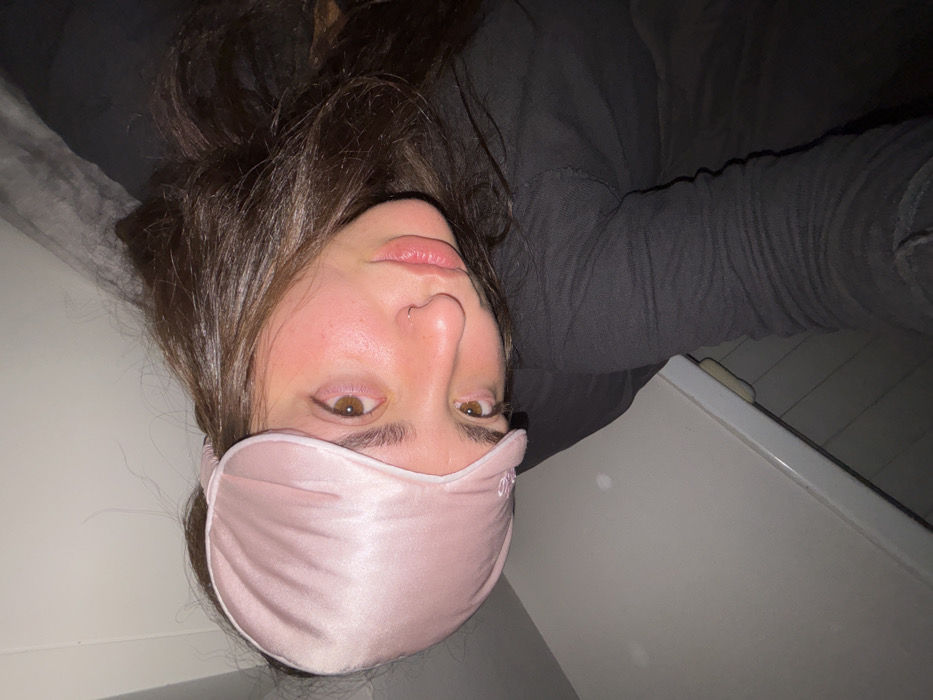 A woman wearing a pink satin eye mask lies with her head at an angle