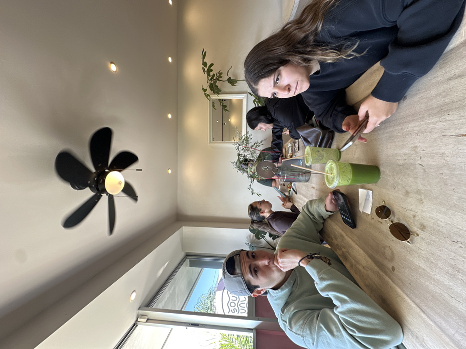 The image depicts an indoor scene within a cafe or eatery in Puebla City, Mexico. The perspective is from a table, looking towards a large window on the left and a back wall on the right. The ceiling is white and features a black five-bladed ceiling fan with a central light fixture, showing motion blur, indicating it is operational. Several recessed spotlights illuminate the space. The walls are a light beige color. A large window on the left reveals a glimpse of a bright outdoor environment with blue sky and green foliage. A partially visible sign outside the window reads "SOU" in white lettering. On the back wall, a white-framed mirror reflects portions of the room and additional recessed lighting. A large potted plant with green leaves stands against the back wall. In the immediate foreground, a long, light-colored wooden communal table occupies the lower half of the frame. On the left side of the table, a young adult male with dark hair, wearing a light green hooded sweatshirt and a gray baseball cap worn backward, is seated. His right hand is near his mouth, and he looks slightly to the right of the camera. A black smartphone and gold-framed sunglasses rest on the table in front of him, alongside a small piece of white paper. To his right, a clear plastic cup filled with a bright green liquid and a straw is present. On the right side of the table, a young adult female with long dark brown hair, wearing a dark long-sleeved top, is seated. She is holding a light-colored smartphone with both hands and looking intently towards the left of the frame with a neutral to slightly stern expression. Another clear plastic cup with a green liquid and straw is positioned near her. Further down the table, in the midground, several other individuals are present. On the left midground, a female with dark hair in a ponytail is visible, looking towards the right side of the frame. In the center midground, partially obscured by a decorative arrangement of greenery in a clear glass vase, another individual is seated. On the right midground, a female with dark hair and a dark top is visible, looking towards the foreground. A dark brown bag is also visible on the table in this area.