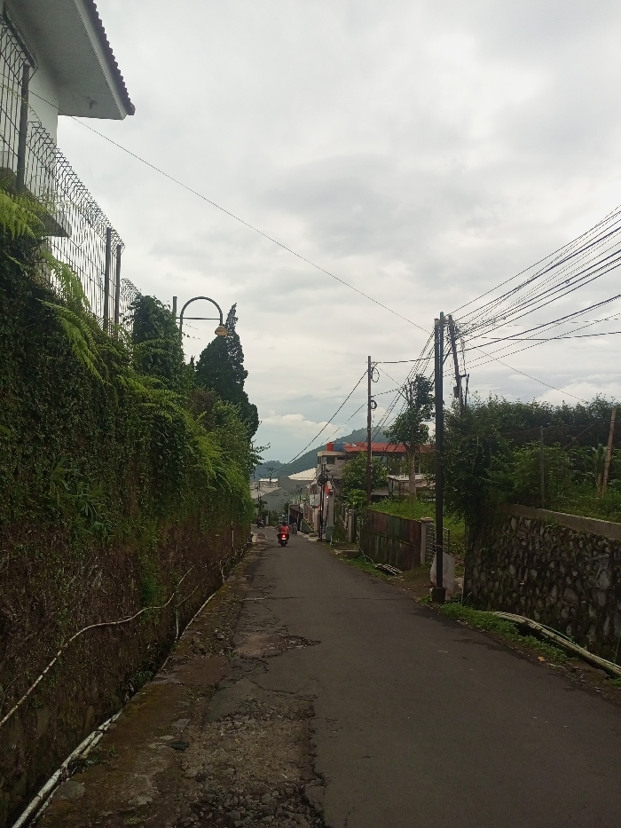 A narrow, cracked asphalt road stretches downhill between stone walls. The left wall is covered in thick, green vegetation. Overhead, a tangle of power lines crisscrosses the sky. A lone motorcyclist in red is seen in the distance. The sky is overcast with gray clouds. Buildings with red tile roofs are visible beyond the end of the road.