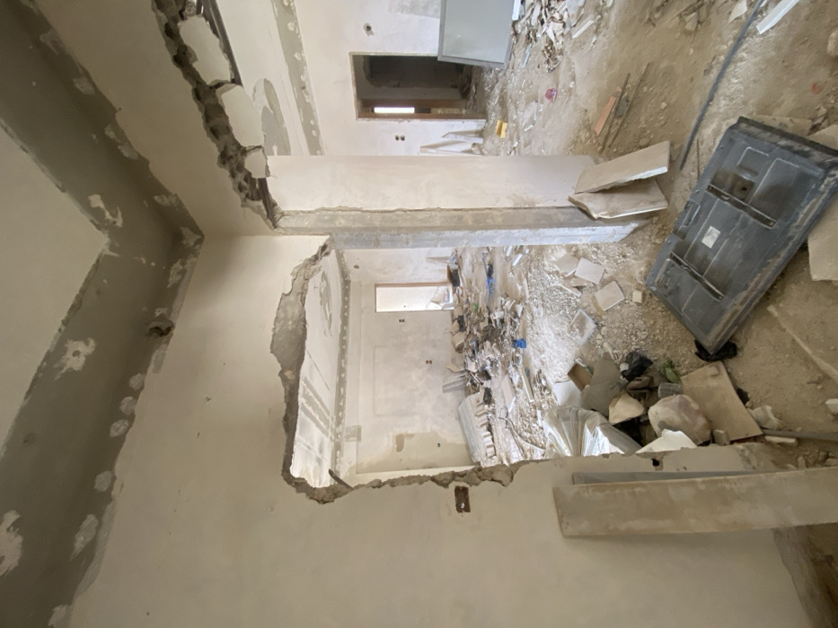 The image depicts the interior of a derelict or severely damaged building in At-Tall, Syria. The scene is characterized by extensive debris, unfinished surfaces, and structural deterioration. The floor is covered with a thick layer of construction refuse, including shattered concrete, plaster fragments, broken ceramic tiles, wires, plastic debris, and general rubble. No people are present. Walls are partially plastered with a light, off-white material, revealing exposed concrete and rough-hewn edges around doorways and ceiling perimeters. Several open doorways, devoid of doors, lead to other equally damaged interior spaces. The ceilings feature exposed concrete beams, some with remnants of decorative plasterwork, including circular motifs and linear moldings, indicating past architectural details now in disrepair. A prominent, partially plastered rectangular concrete pillar stands in the mid-ground. In the immediate foreground, a large, dark-colored object resembling the rear casing of a flat-screen television or monitor lies face down amidst the debris. The overall environment suggests a building undergoing demolition, extensive renovation, or suffering from significant neglect and damage.