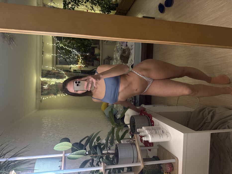 A woman stands in front of a mirror, facing forward, holding a phone to take a picture. She wears a blue spaghetti strap top and a white patterned thong. The image is a reflection of the room, showing plants, a white shelf with bottles, and a bed with a cat on it. String lights hang near the top of the mirror. The room is dimly lit.