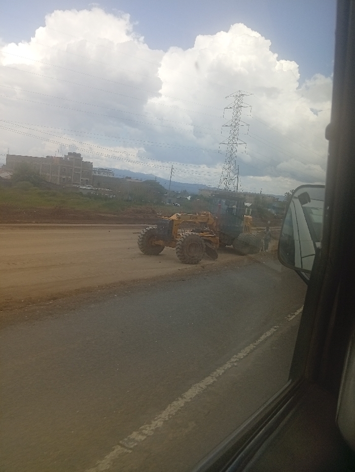 The image provides a daytime view from inside a vehicle, looking out a passenger window, depicting a construction scene in Viwandani ward, Kenya. In the immediate foreground on the right, a dark vehicle door frame and a side mirror are partially visible, bordering a paved road surface with a faded white lane marker. Adjacent to the paved road, a wide, unpaved dirt surface dominates the midground. Positioned on this dirt surface is a large yellow construction vehicle, resembling a grader or front-end loader. Behind and partially obscured by the yellow vehicle, a darker, heavy piece of machinery, possibly a dump truck or earthmover, is present. Several indistinct figures, presumed to be construction workers, are visible gathered near the rear of the heavy machinery. The background features a multi-story building with a distinctive architectural style, possibly a commercial or residential complex, situated on an elevated plot to the left. A prominent metal lattice-work electricity pylon stands to the right in the background, with multiple power lines traversing the sky. Distant hills or mountains are faintly visible under a sky dominated by large cumulus clouds. The environment indicates ongoing infrastructure development.