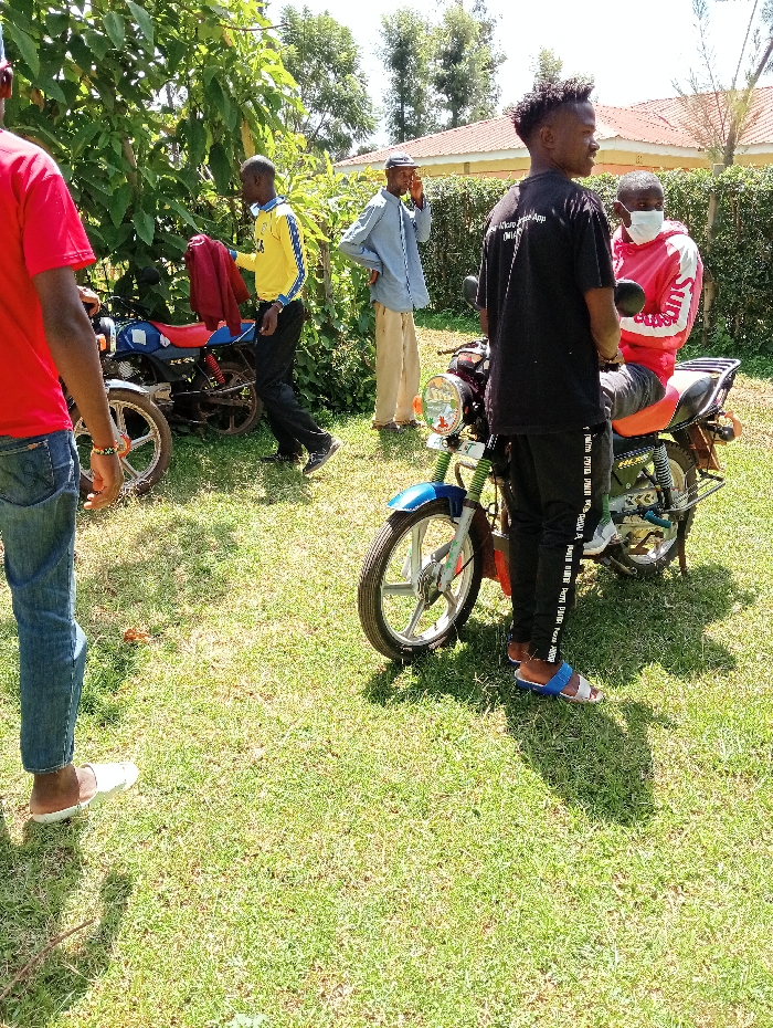 This image, located in Lumakanda ward, Kenya, depicts an outdoor scene featuring five males and three motorcycles on a sunny day
