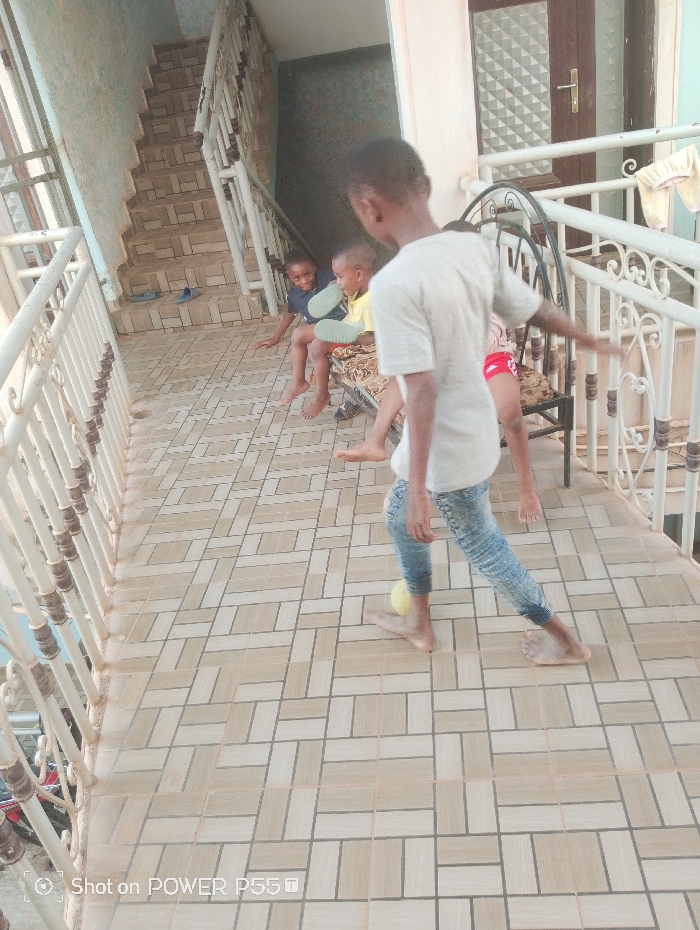 The image captures a scene in a tiled corridor or veranda of a residential building in Sabon Tasha, Nigeria. Four children are present. In the foreground, a barefoot child, wearing a light-colored short-sleeved t-shirt and faded blue cropped jeans, is positioned with their back mostly towards the viewer, actively controlling a yellow ball with their bare feet on the light brown and beige patterned tiled floor. To the left of the foreground child, two younger barefoot children are seated on a dark metal bench with a patterned cushion. The child on the left, in a dark blue t-shirt, is smiling towards the camera, while the child next to them, wearing a yellow t-shirt, holds a light-colored sandal. A fourth child, wearing red shorts, is partially visible seated on the same bench behind the foreground child. To the far left, a light-colored metal-railed staircase ascends upwards, with two pairs of sandals (one blue, one light blue) resting on its steps. Light-colored metal railings, consistent with the staircase, border the tiled area on the left. In the background on the right, a wooden door with a decorative glass panel is visible, and a light-colored garment hangs over an adjacent railing.