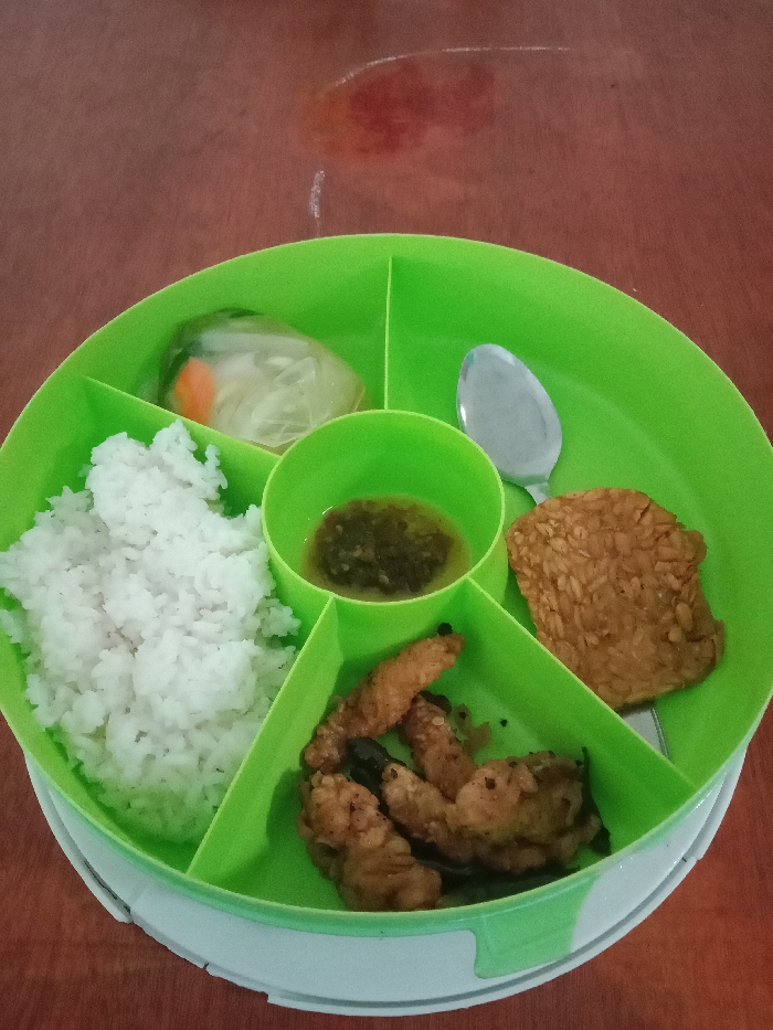 A divided, bright green plate holds a meal. White rice fills one section, next to a smaller container of dark green sauce. Fried strips of what appears to be chicken are in the next section. Then there is a piece of tempeh, and a pickled vegetable, possibly cucumber, wrapped in plastic, occupies the final area. A spoon rests on the plate. The plate sits on a brown surface with a blurry dark stain near the top.