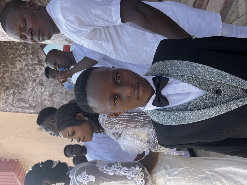 An outdoor scene in the city of Unknown, Nigeria, depicts a group of individuals gathered, primarily dressed in formal and traditional attire. A young male child, approximately 8-12 years old, with dark skin and a short fade haircut, occupies the central foreground, looking directly at the viewer with a neutral expression. He is dressed in a black tuxedo jacket featuring wide, light grey textured lapels, a matching light grey textured waistcoat, a white collared shirt, and a black bow tie. To the child's left, partially visible, is a female adult wearing a white formal dress with lace embroidered sleeves and an elaborate hairstyle. Behind her, another female adult with dark hair and visible makeup is seen wearing a shimmering white, possibly beaded or sequined, long-sleeved dress, looking towards her left. Other individuals, mainly male adults in white traditional Nigerian garments, are partially visible further back on the left. To the child's right, a male adult in a white traditional Nigerian tunic with embroidered patterns stands, his eyes partially closed. Behind him, additional male adults in white attire are visible, one of whom is drinking from a clear plastic water bottle. The background features a light brown or beige textured building wall. The setting appears to be an outdoor gathering under natural daylight.