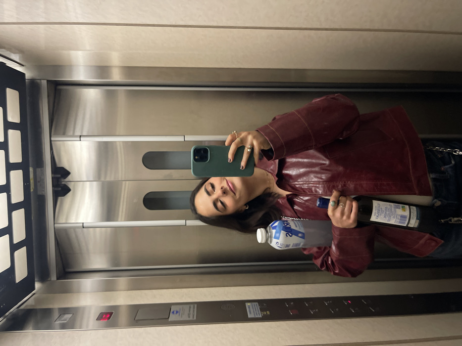 In an elevator, a young woman takes a selfie. She's wearing a maroon leather jacket and jeans with a chain. She holds a bottle of wine and a plastic water bottle. The elevator's walls are brushed stainless steel. Buttons and informational plaques are visible near the bottom. The phone case is a dark green color. She has several rings on her fingers.