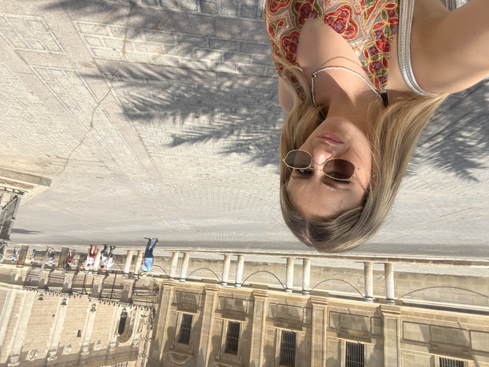 A woman with blonde hair, wearing sunglasses and a patterned top, takes a selfie. She is standing on a brick-paved area. Behind her, a building with columns and multiple windows extends, partially obscured by other people standing on a higher level. The shadows of palm leaves fall across the pavement. The photograph is taken from an unusual angle, appearing upside-down.