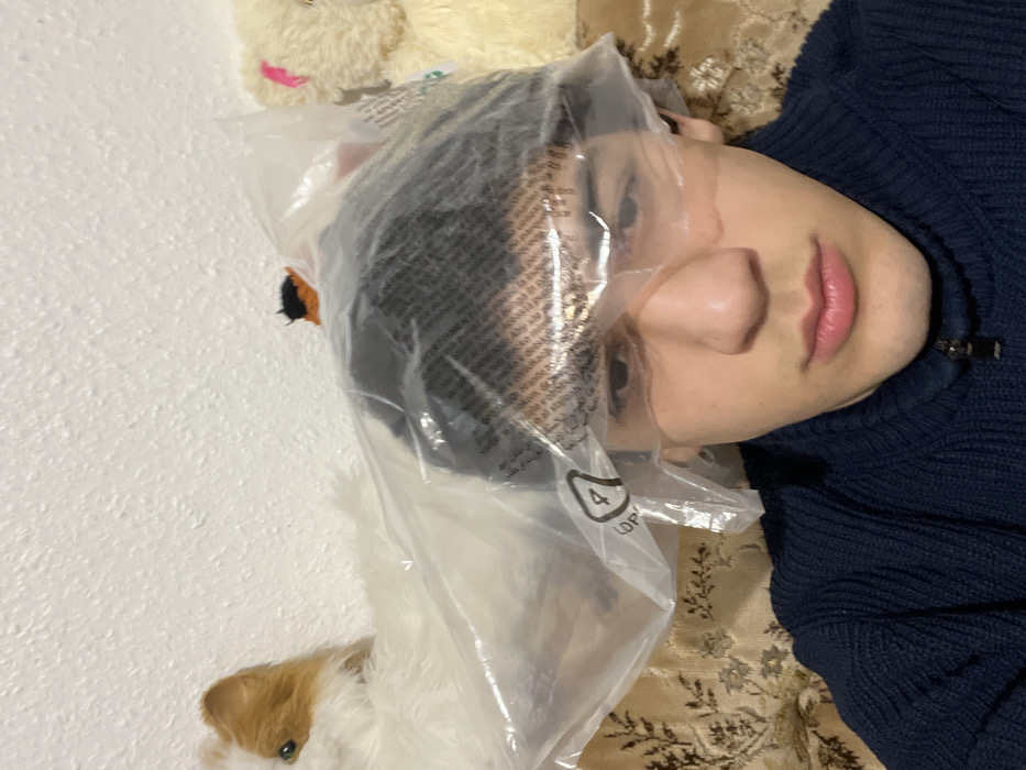 A person lies on a patterned surface, wearing a dark blue sweater. A plastic bag covers the person's head, obscuring their hair. A stuffed animal is positioned near the bag. The background features a plain, light-colored wall.