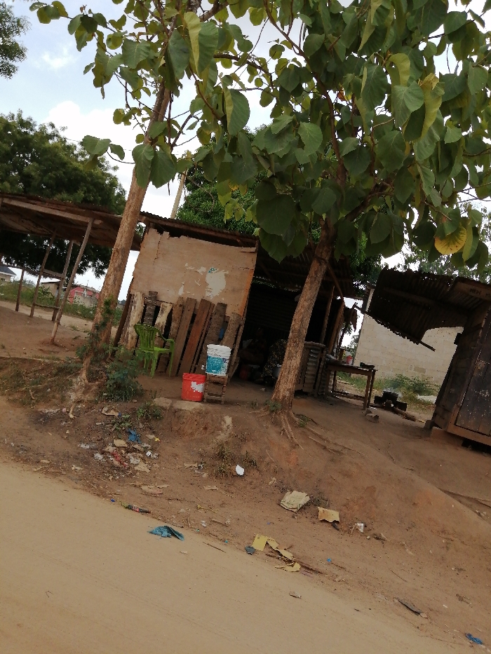 The image depicts a roadside scene in what appears to be a peri-urban or informal commercial area, consistent with environments found within or on the outskirts of Dar es-Salaam, Tanzania. The foreground features an unpaved dirt road or track that slopes upwards to the right. The ground is dry, reddish-brown earth, littered with various items of refuse including torn plastic bags, crumpled papers, and pieces of cardboard. Two mature trees with prominent green, broad leaves and thick brown trunks dominate the midground. Their roots are visible, partially exposed above the ground. These trees are positioned in front of and between two rudimentary single-story structures with corrugated metal roofs. The structure on the left has light-colored, possibly painted or stuccoed, walls that appear weathered and partially peeling. It is partially obscured by the left tree trunk and appears to be open-fronted, revealing a shadowed interior. Against its front wall, a stack of vertical wooden planks or boards is visible. To the left of these planks, a single lime-green plastic chair is positioned. Below the planks, a white and blue plastic bucket is stacked on a wooden base, next to a red plastic bucket. A dimly discernible human figure is present within the shadowed interior of this structure. The structure on the right is darker, possibly constructed from weathered wood or darker materials, also with a corrugated metal roof. It is largely open-fronted, with a wooden table or workbench positioned towards its interior right. Further to the right, behind the table, what appears to be a small fire or smoke source is vaguely visible on the ground. The far right side of the image shows a partial view of another light-colored, block-construction wall in the background. The background further beyond the structures includes additional green foliage and a distant, partially visible residential building with a red roof under a light grey, overcast sky. No direct interactions or distinct actions are apparent in the static scene.
